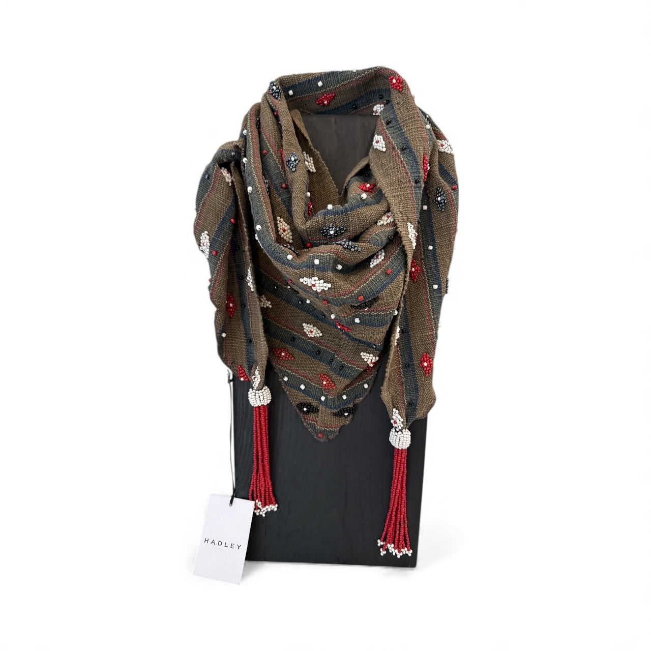 Discover the artisanal appeal of our most coveted wrap scarf, a hand-woven treasure adorned with intricate beading. Each piece emerges as a singular creation from our Bali artisans, ensuring no two scarves are identical—you'll receive a comparable design within the same textile family, with natural variations in beadwork that celebrate its handmade origin. Crafted with meticulous care and designed for longevity, this scarf requires gentle hand spot cleaning. A wearable work of art made with intention in Indonesia.
